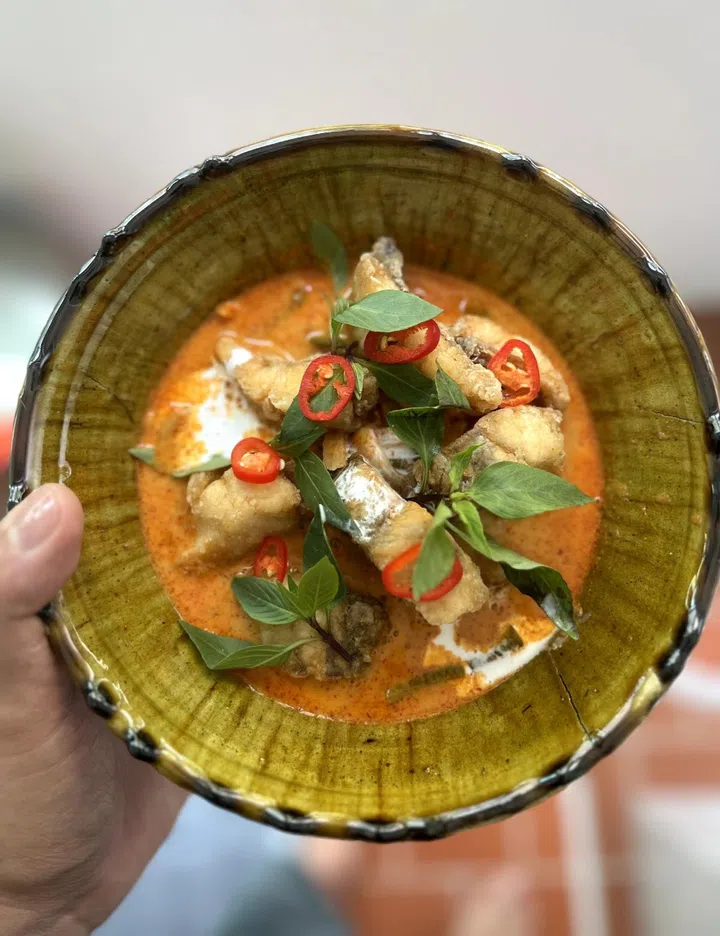 Panang pla: "Red curry with crispy seabass (pictured). This is something we ate a lot of growing up. It's a red curry made with bamboo shoots, baby eggplants and topped with crispy fish. It's hearty and rich and you can keep going if there's a bowl of rice to accompany the curry."