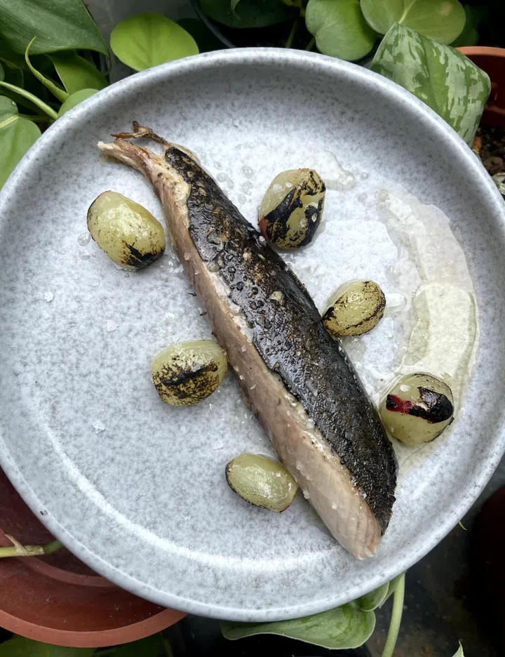 Torched tuna with grapes marinated in balsamic vinegar: "The combination of flamed tuna (pictured) and the acidity of sweet grapes is mindblowing."