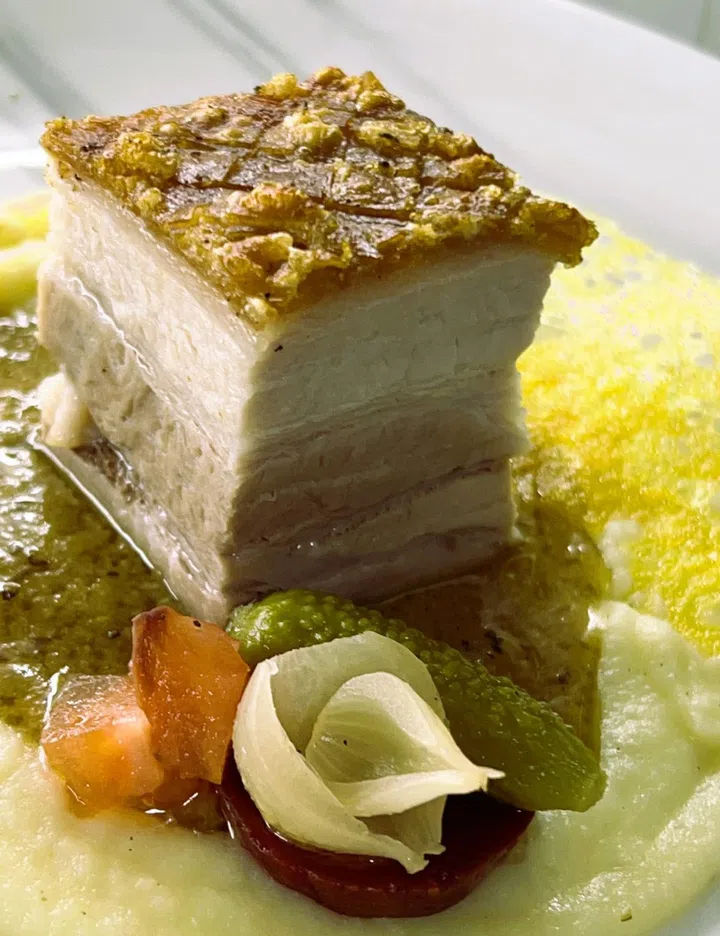 Pressed belly of pork (free range): "Three-hour oven-cooked free-range pork belly, crackling on the outside, juicy as you bite. Served with a garlic reduction sauce."