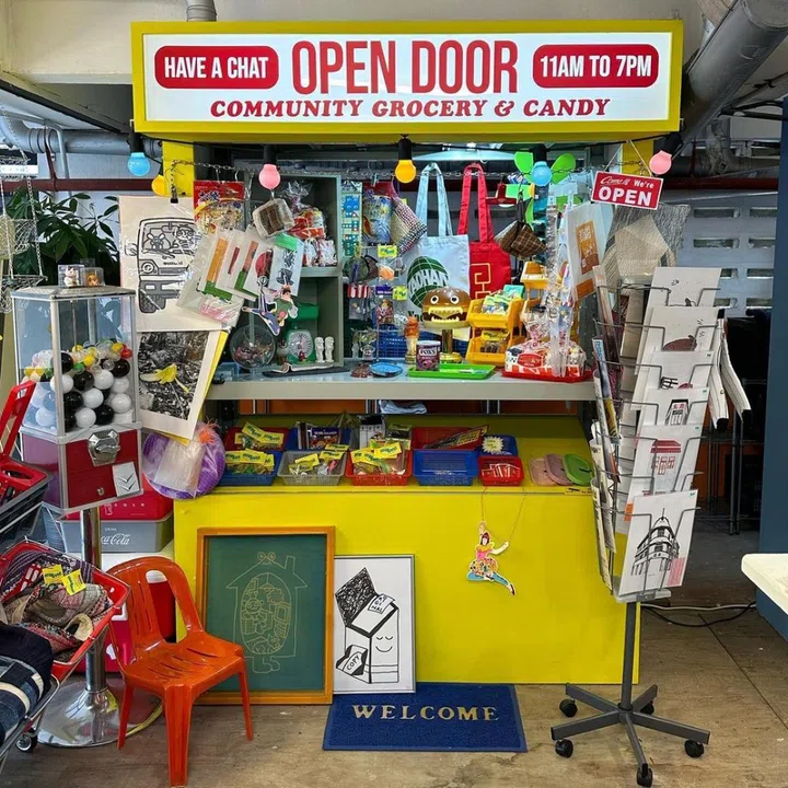 For the founders, it is about the need for a space where customers can physically view and interact with the works of local artists and creatives. As opposed to, say, flat images on an online shop. There’s a scrappy DIY spirit at play here too. Most of the furniture at Open Door is built by hand by the owners. The highlights are the delightfully old-school mama shop storefront kiosks, which are also decorated with snacks, drinks, toys and knick-knacks that Goh sources from actual mama shops in his neighbourhood.
