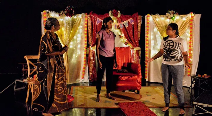 Actors Padma Sagaram, Aiswarya Nair, and Sanchala Sanju in Strawberry Girls, written and directed by theatre-maker Aswani Aswath. Strawberry Girls is one of the many independent plays that showcased in the A Mirage platform (co-founded by Theo Chen and arts manager Pearlyn Tay), which espouses a grassroots approach to theatre-making and sharing profits among all involved.
