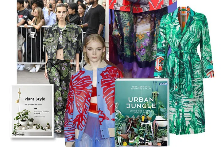 Clockwise from right: A Maison Alma trenchcoat with botanical prints by French textile maker Pierre Frey; Urban Jungle: Living and Styling with Plants; No. 21; Plant Style: How to Greenify Your Space; Baja East; Gucci