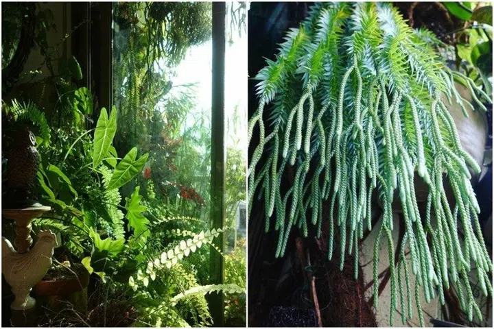 Growing ferns is a forte that Ip hones. Meanwhile, dramatic plant genus like the Huperzia (right) adds to the dramatic design of his indoor garden.
