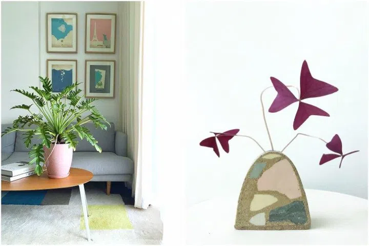 Pang melds his love for Scandi furniture design and theatrical-looking plants. Some of his favourite plants are the Philodendron Xanadu (left) and the Oxalis triangularis.