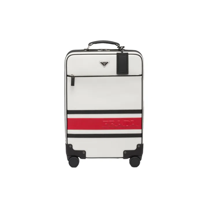 Sleek and sporty, Prada’s cabin-sized leather trolley bag comes with an external pocket, so you can keep your travel essentials within easy reach.