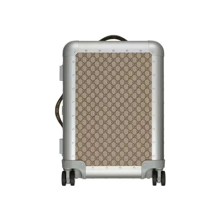 Decked in the house’s unmistakeable GG logo, this aluminium-trimmed trolley comes with four 360° spinner wheels, canvas-covered handles, logoed nylon interiors and a matching luggage tag.