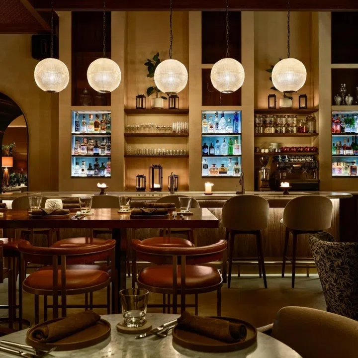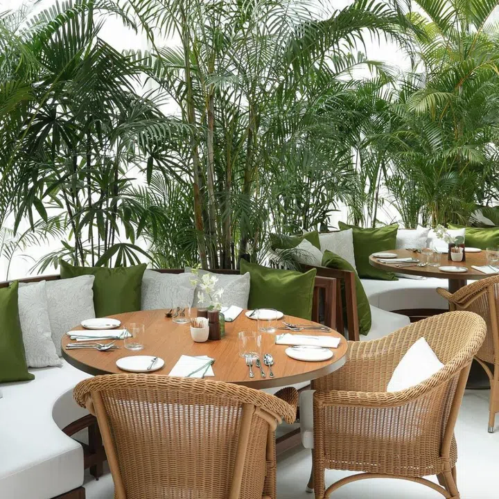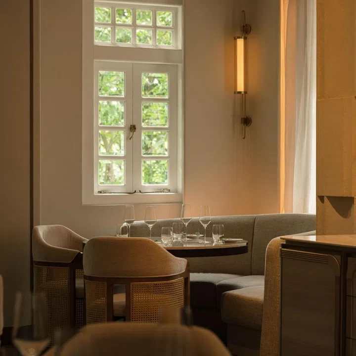 The aesthetic: The restaurant occupies the former site of the one-Michelin-starred Corner House. The 30-seat restaurant exudes a colonial-style breezy-luxe ambiance. Chairs feature fabric upholstery and rattan trim, and the space includes a private dining room that seats six to 12.
