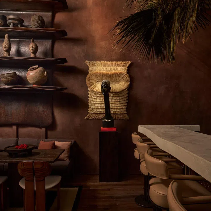 The aesthetic: Led by international designer Virginia Pérez-Orive, the space reflects a two-year journey of research and curation. The walls, with their intricate and rustic texture, are redolent of the effect of wind on sand, while the wooden mural crafted by renowned French sculptor Etienne Moyat takes centre stage and resembles the soft and uneven geometric Africa. The team has carefully chosen every detail of the interior, from the clay vessels and artefacts to the carved Tuareg-staff door handles, as a deliberate expression of Tamba’s spirit.