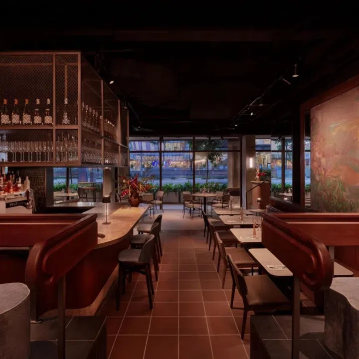 The aesthetic: Award-winning architectural firm WOHA spearheads the design of the 71-seater bistro & bar, with the intention of creating a convivial atmosphere for guests to linger for longer from day to night. The venue showcases a contemporary design reminiscent of 1930s Art Deco banking halls, retaining original building materials like upcycled wooden joists framing huge windows. Two large-scale paintings, commissioned from Singaporean artist Khairulddin Wahab, are put together by The Artling.