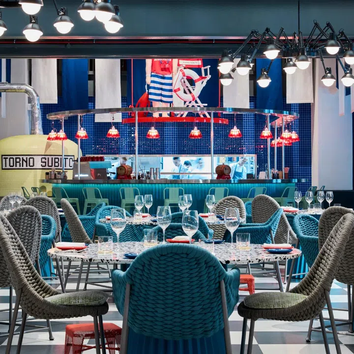 The aesthetic: Designed by award-winning Italian designer Paola Navone of Otto Studio, expect a bright display of unexpected colours and textures. The roughly 10,800 sq ft space delivers vibrant expressions reminiscent of idyllic holidays by the Adriatic seaside. At the heart of the 110-seat restaurant is a seaside-inspired ‘beach bar’, with lamps crafted from Campari soda bottles and an aged Negroni-filled Campari barrel on the counter.