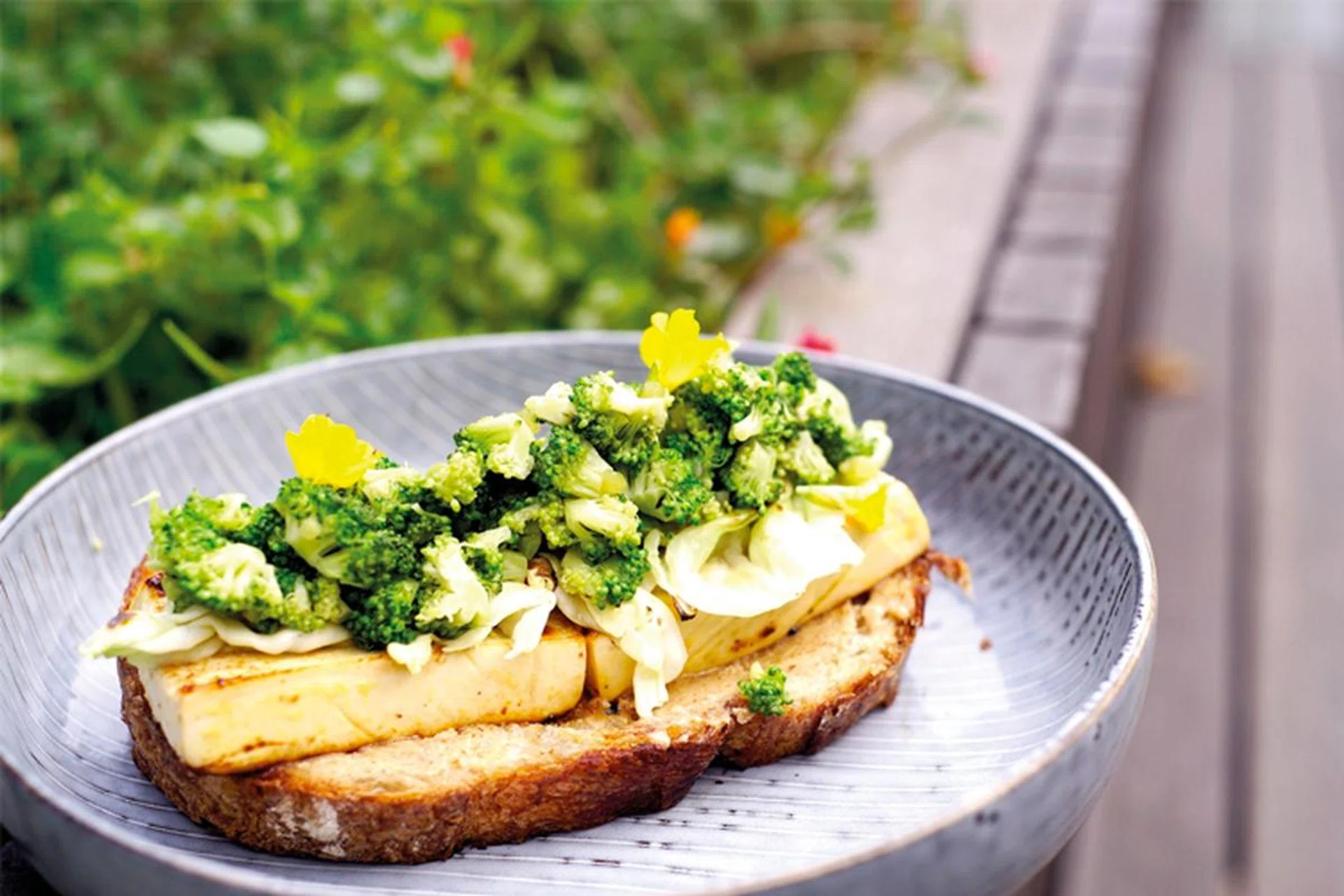 The bread is topped with a slab of orange-glazed grilled tofu (marinated overnight in orange juice before grilling, for a citrusy touch). Broccoli and cauliflower florets blanched in kelp stock add a welcome crunch, and the brightness from the pickled yellow zucchini ribbons balances the dish perfectly.