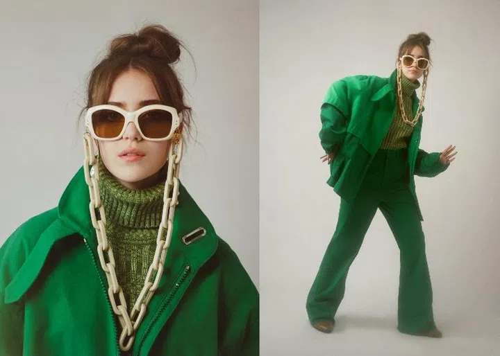 Cotton parka, matching pants, wool and cotton turtleneck, acetate sunglasses with resin chain, and leather boots, Gucci.