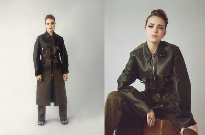 Leather and cotton gabardine coat, cotton gabardine pants and leather sandals, Hermes. Lady Grey gold-plated metal rings, www.ladygreyjewelry.com. Jack Vartanian metal earring (on this page; sold as a pair), us.jackvartanian.com.