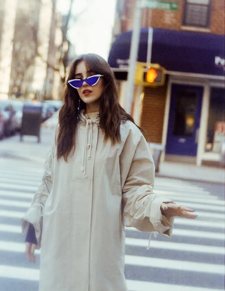 Cotton parka, Stella McCartney. Le Specs x Adam Selman acetate sunglasses, www.lespecs.com. Jack Vartanian metal and pearl earring (sold as a pair), us.jackvartanian.com. Lady Grey gold-plated metal rings, www.ladygreyjewelry.com. Sweater, stylist’s own.