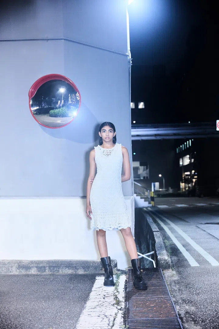 Model or role model? We say both. Singapore teenage racer Kareen Kaur cuts a striking figure both on and off the tracks with her natural poise and laser‑sharp focus. The 15‑year‑old was the highest‑placing female driver at the ROK Cup Singapore 2024 championship – the local leg of the global karting competition of the same name – and is the first female driver here to be certified to race in Formula 4. Kareen wears cotton crotchet knit dress and Dior Empreinte calfskin boots, Dior. Slip dress (worn under dress), stylist’s own