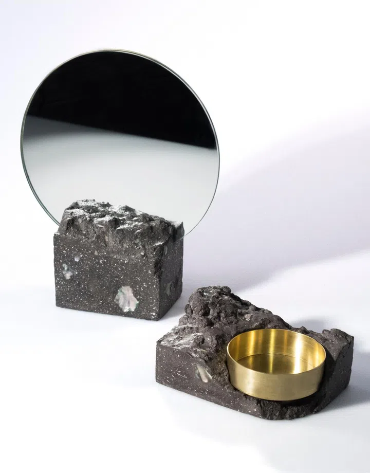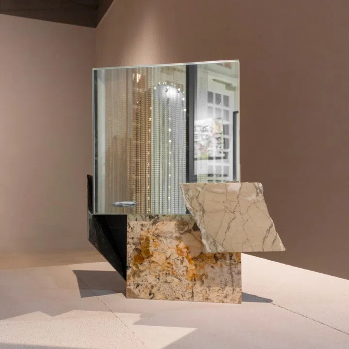 In this exhibit, European marble offcuts from factories, unused mild steel and panels of mirrors (garnered from contractors) are composed into abstract geometric homeware. The statement-making pieces are then finished off with raw concrete.