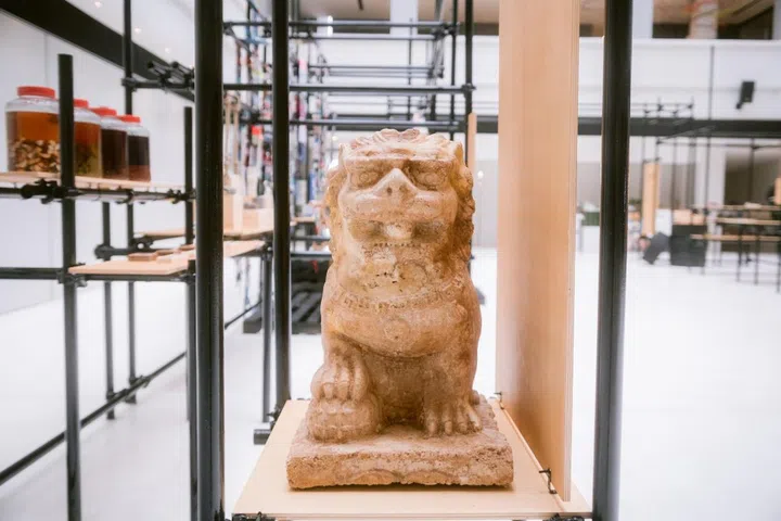 Guardian lions are typically carved from stone obtained through destructive mining. However, the ones in this exhibit are grown into shape using mycelium (the root system of mushrooms). Grown on agricultural by-product, mycelium has been hailed as the building block of the future − thanks to its ability to turn waste into a useful resource.