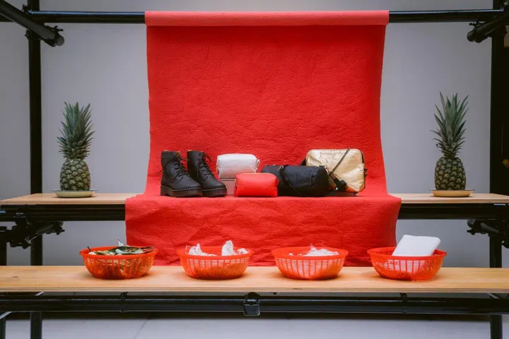 According to statistics, an estimated 76 million tonnes of pineapple leaves are wasted by the pineapple industry each year. Here, Pinatex is put to good use by pioneer manufacturer Ananas Anam, which put together the exhibit of shoes and bags.