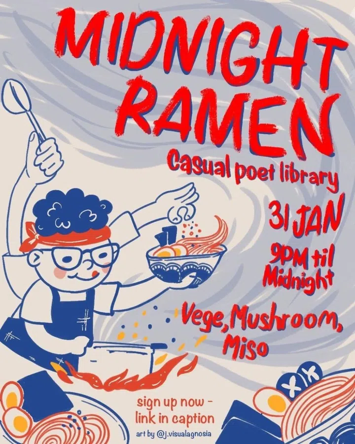 Late-night ramen, chill vibes, and conversations that actually flow. Casual Poet Library turns into a cozy hangout where vegetarian bowls take center stage, and everyone’s welcome to just show up, slurp, and stay awhile. Proceeds go to supporting families in Gaza, so your midnight cravings come with a side of good karma.
