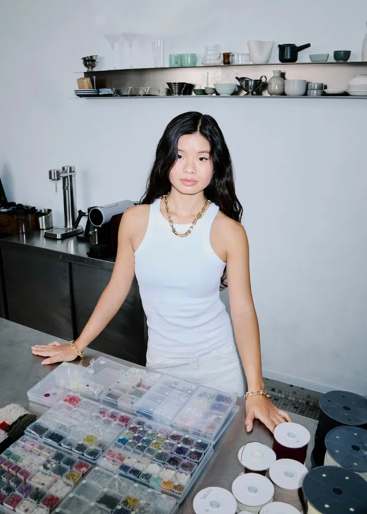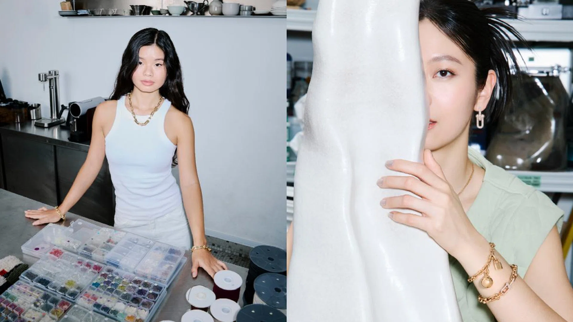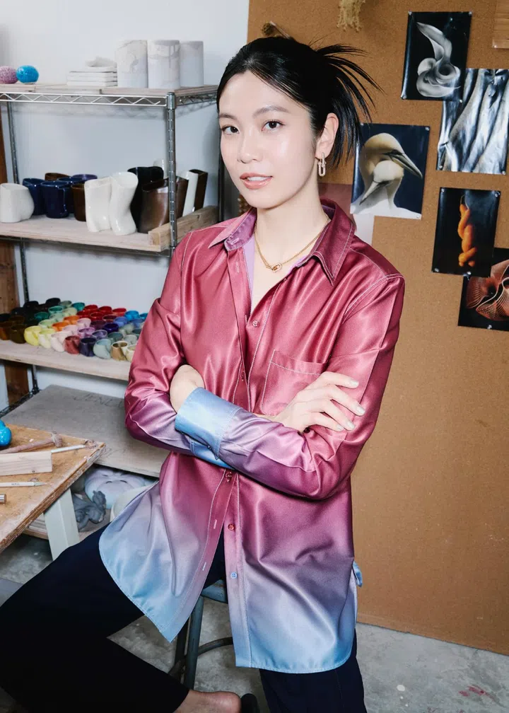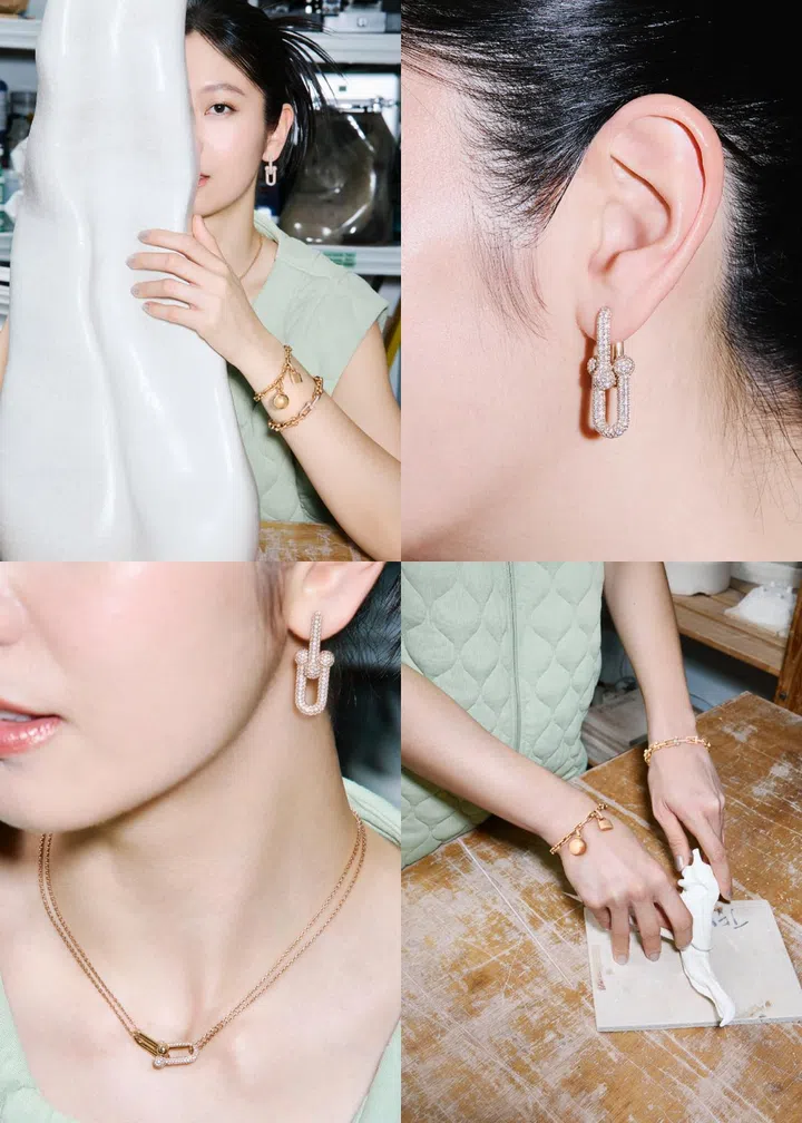 At Jenevieve Studio, which she founded in 2021, Woon fashions what she calls “happy objects” – the likes of misshapen yet utterly elegant vases, and cups and paperweights modelled after fruits and vegetables – out of clay through slip casting. All the moulds she uses are hand‑made by her and her team – a time‑ and labour‑intensive process – and every single piece is hand‑finished. “I think we all yearn for objects that feel human – when one can tell that something has been made by someone who loves what they do,” she says. “I’m always interested in making things through which the hand of the maker or artist is evident.” A fine example from the house of Tiffany & Co.: the paved HardWear creations, which feature diamonds hand‑set one by one by the brand’s artisans to achieve maximum brilliance. The fully paved earrings Woon wears here, for example, feature 650 diamonds and took nearly three days to complete.