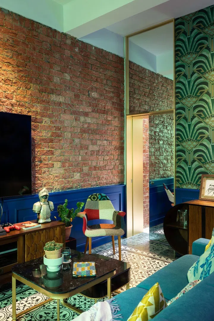 Other key features in the living room are the Great Gatsby-inspired wallpaper that references the Art Deco buildings of the area, and a gold-framed full-height mirror tucked away in the corner.