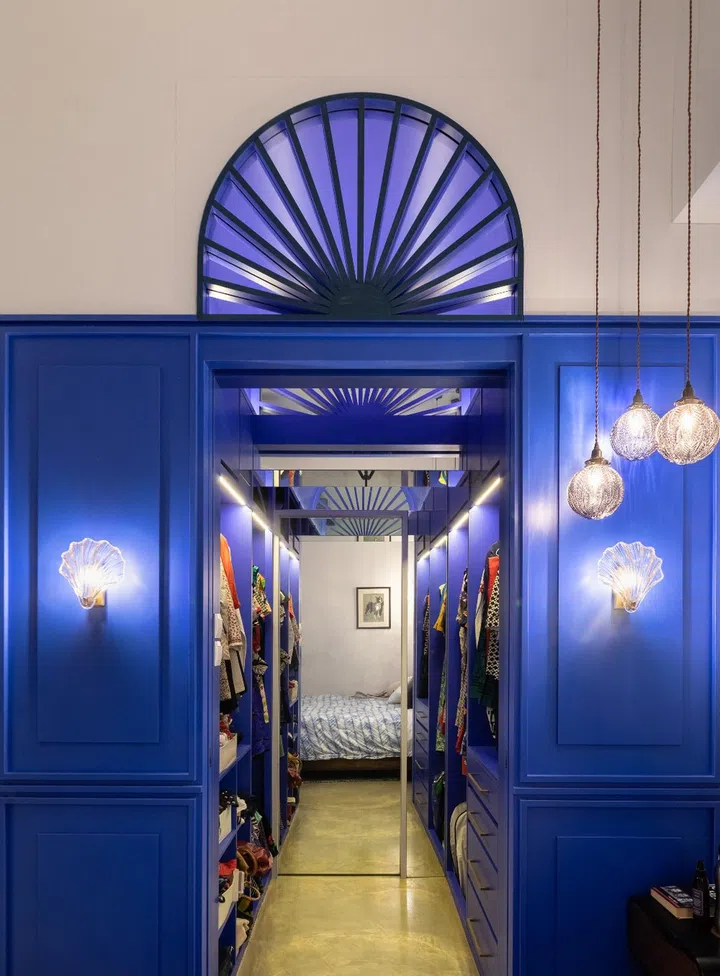 This same colour is also seen on the wall cladding in the living room, providing a contrast to the exposed original brickwork and the floral patterned floor. In the master bedroom, the walk-in wardrobe is also given the same royal blue treatment.