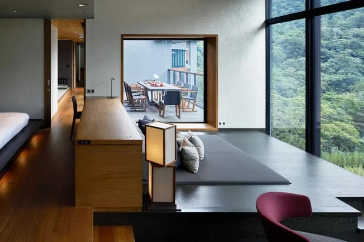 Amenities include both outdoor and indoor public hot springs, as well as a spa and open lounge. Each guest room also features a private onsen bath. Guest rooms are designed like maisonettes, with an entire floor laid out just for hot spring bathing.
