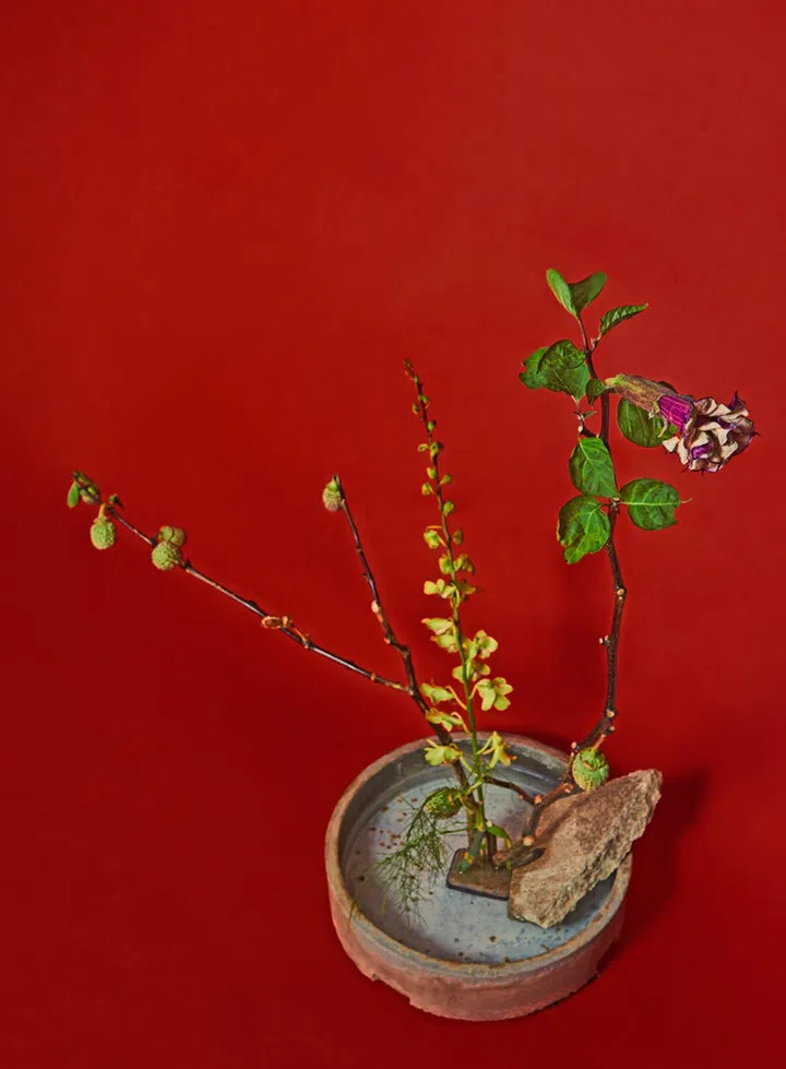 Perhaps the aesthetic doesn’t careen too far off the common perception of ikebana but Wabi Sabi’s organic approach does. The flowers they use depend on what’s available at the nursery. Arrangements, which have been displayed at modish tea space Antea Social and artisanal label Soma Folk’s pop-up in August, change from week to week depending on their mood. Additional material may be sourced at unlikely locales – the rock used in this arrangement was found by the roadside, while the concrete basin was repurposed from Seow’s home.“We find ourselves subconsciously inspired by different elements around us, daily commodities such as books, people, emotions and even life crises that we are facing… Our end product is usually a balance of happiness and sadness — very much like yin and yang,” says Lai. In other words, the only limit is the imagination.