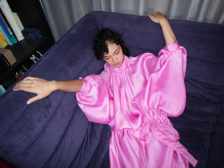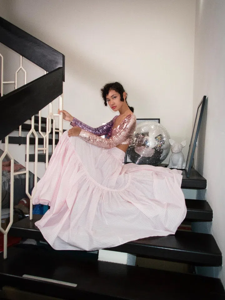 Jenn wears Chopova Lowena cotton dress, Dover Street Market Singapore, and her own jewellery and belt