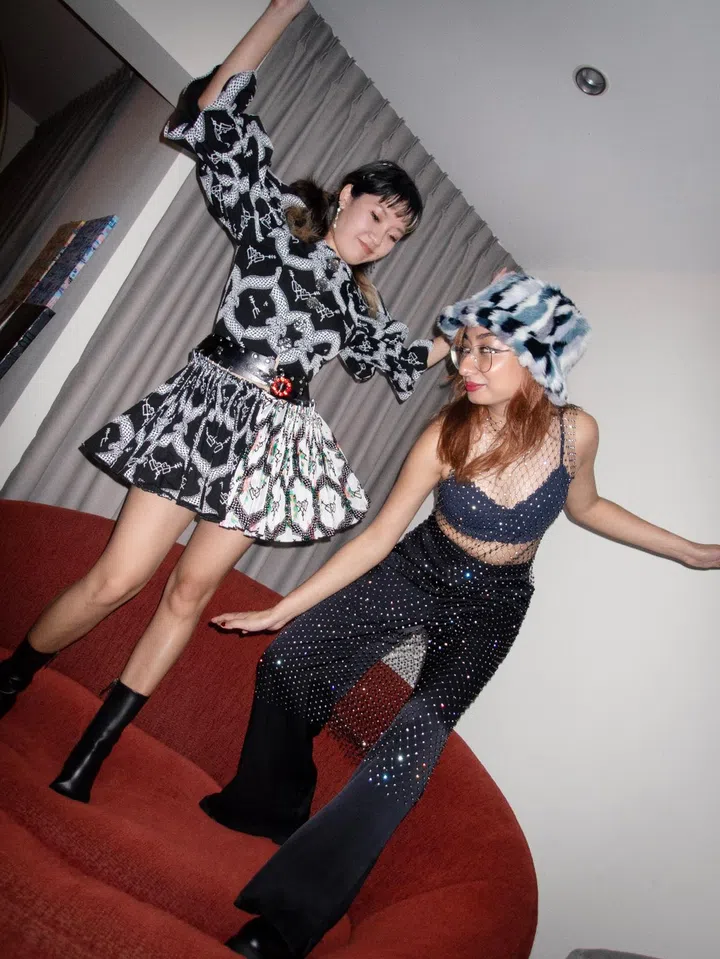 Jenn wears Chopova Lowena cotton dress, Dover Street Market Singapore, and her own jewellery, belt and boots, and Natasha wears her own clothes