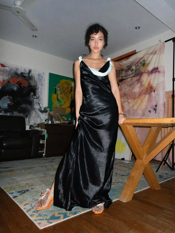 Sofia wears satin gown and lambskin leather sandals with raffia pom‐poms, Bottega Veneta