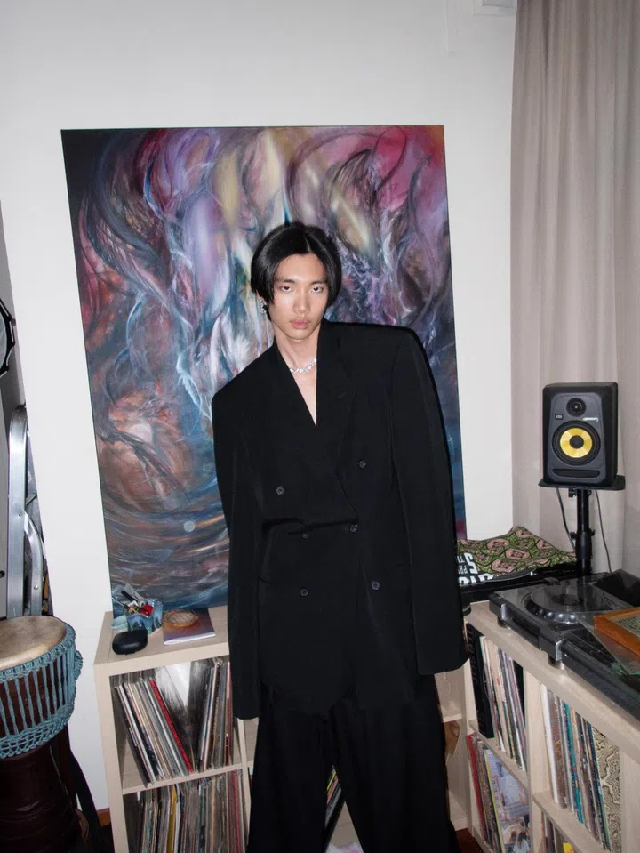 Lucas wears wool jacket and matching double‐front pants, Balenciaga. Jewellery, his own