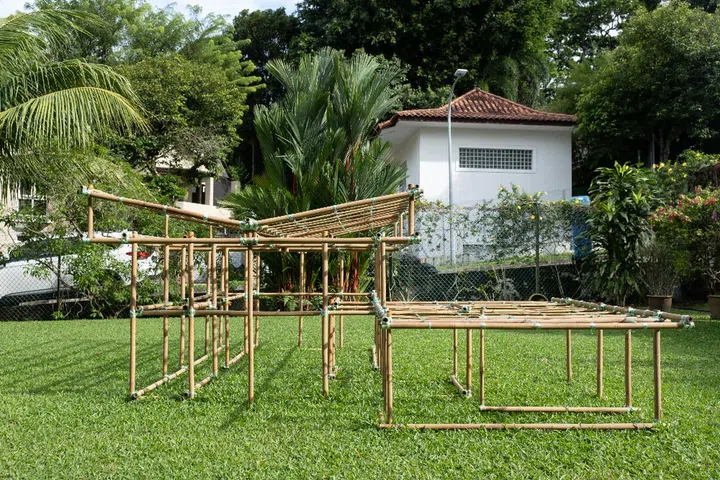 Tan Ngiap Heng (show producer, artist, and current resident of the house) very kindly let me set up slightly earlier, in December, so there was some buffer in case anything went wrong, and also to let the structure (pictured) weather a little bit into its surroundings. I was terrified the whole thing would just fall apart in the rain but I think it turned out okay in the end (fingers crossed)."