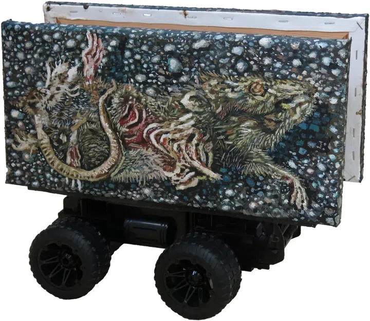 "My Heart Will Go On and On and On is the culmination of works I've produced since late 2022 (pictured is Reanimated Dead Rat, 2023, oil on canvas, wood, remote control toy car and remote control). If I could summarise the exhibition in a sentence, it would be about a love for the unloved. It goes a step deeper than what I have done previously with my paintings of everyday life by focusing on literally unwanted things. The subject matter I have painted consists of things I have seen lying on the street, be it an eggplant that has been driven over, a handwritten note, or a discarded cigarette box. They are viewed from above, almost like an autopsy, and often, they have the visual qualities of being flattened. Not only are they things that I encounter in daily life, but they are also things that we do not want anymore: rubbish, forgotten, unasked for. I came across these things during my travels in different cities, including Kuala Lumpur, Seoul, Sydney, Amsterdam, etc. For me, the visual coherence among all these objects from different parts of the world marks a kind of universalism of experience and emotions amid the specificity of these particular things. Through a focus on these everyday things, narratives of memory, love, and death seep through each painting."