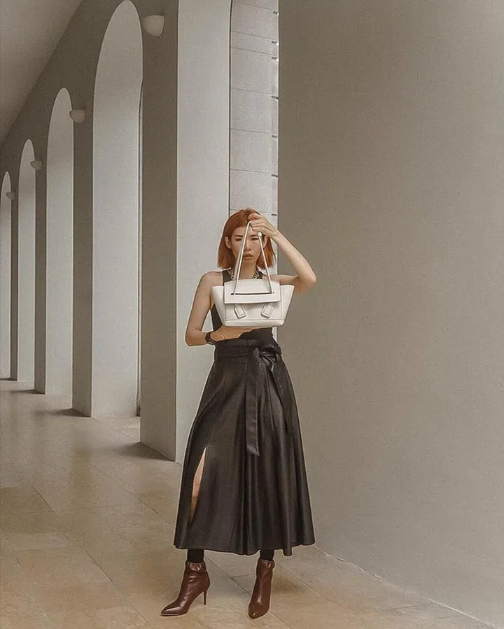 Nicole Wong proves that you don’t have to do the old glitz-and-glam shebang when the invitation card to a party states “evening glam”. The sleeveless belted dress with a subtle sexy thigh slit modernises the evening dress and the sexy quotient is upped when you pair it with high-heeled ankle boots. But the piece de resistance? A roomy but mini tote because you’re going to want to be prepared (aka your deodorant + cards + makeup is going to fit in it).