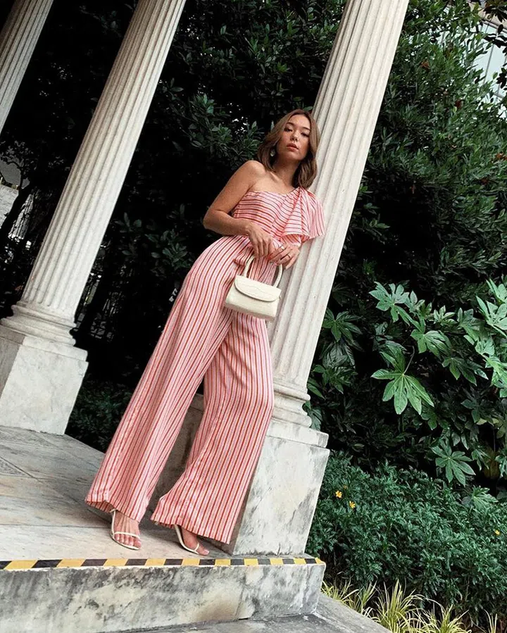 It’s the weekend and after a week of considering what’s office appropriate, you might be tempted to slip into the bedrock of every Singaporeans’ weekend wear – the denim shorts and thong slippers. But Andrea Chong proves that acing the elevated weekend wear doesn’t require bells and whistles – all you need to do is to slip on an off-shoulder jumpsuit and pair it with strappy sandals. There, you’re done in less than 10 minutes.