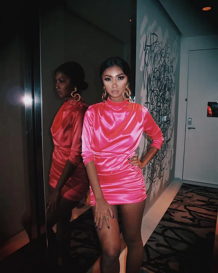 The fluorescent pink ruched satin dress, the giant gold graphic earrings and the severely slicked back hair – Camira took a time warp to the ‘80s (the good part fyi) and it’s not hard to see why when fashion designers such as Michael Kors or Saint Laurent are doing it. In an era where club girls love wearing bandage dresses or streetwear, you’re going to want to be that chick who shows them up.