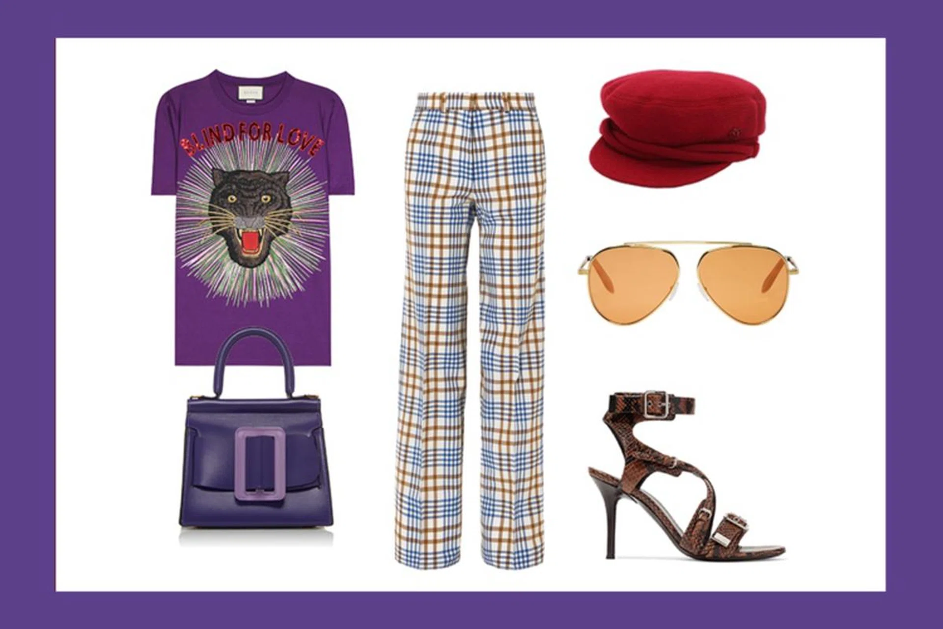 Clockwise: Sequinned printed t-shirt by Gucci, €750 (S$1,192), via Mytheresa, Wool and mohair blend checkered pants by Victoria Beckham, £790 (S$1,427), via Net-a-Porter, Wool cabby hat by Maison Michel, S$661, via Luisaviaroma, Orange tinted aviators by Victoria Beckham, US$350 (S$477), via Ssense, Buckled leather snake-effect heeled sandals by Chloe, £630 (S$1,138), via Net-a-Porter, Top handle leather bag with buckle detail by Boyy, US$895 (S$1,220), via Moda Operandi