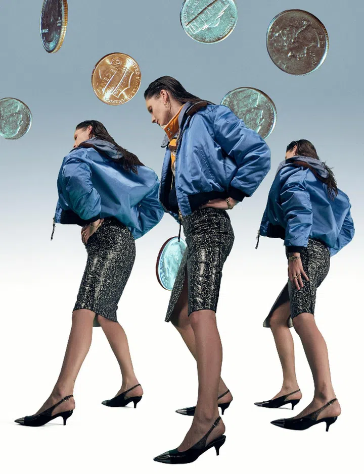 Nylon bomber jacket, wool pullover, leather pencil skirt and slingbacks, Louis Vuitton. Clash de Cartier small 18K pink gold hoop earring (sold as a pair), Panthere de Cartier rings in 18K gold with emeralds and diamonds or tsavorite garnets and onyx (on middle finger), and 18K yellow gold with tsavorite garnets and onyx (on fourth finger) and La Panthere 18K yellow gold watch with diamonds, tsavorites, lacquer and quartz, Cartier. Antitragus earring, stylist's own