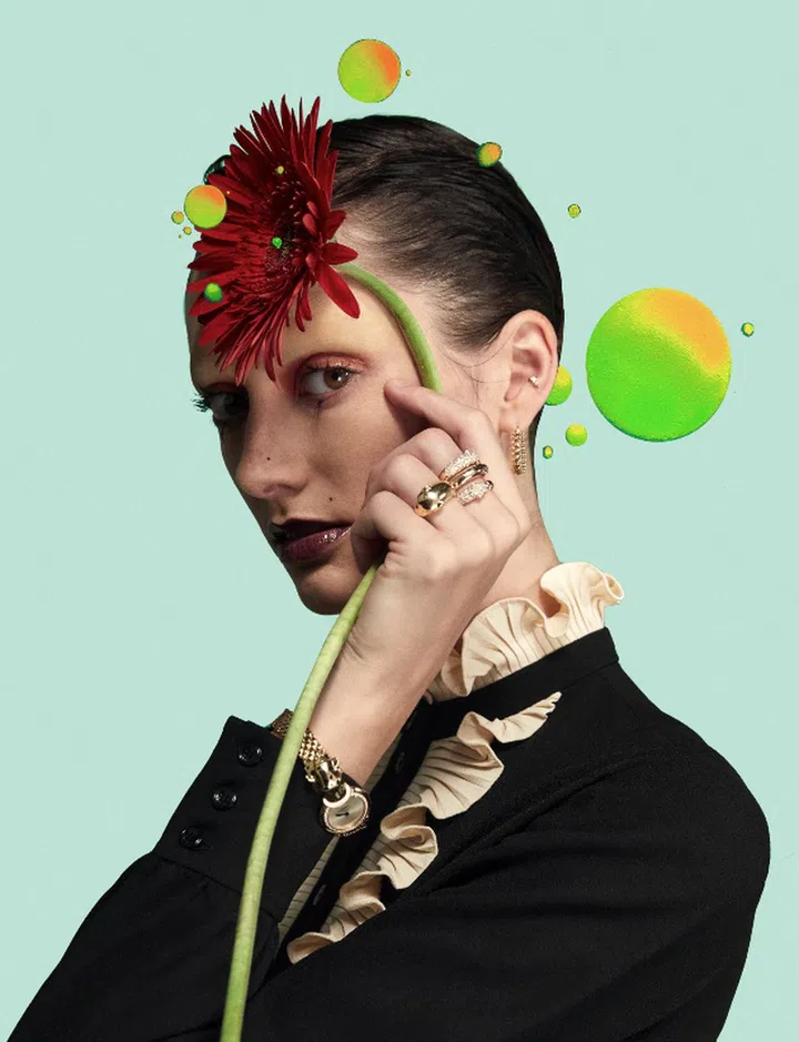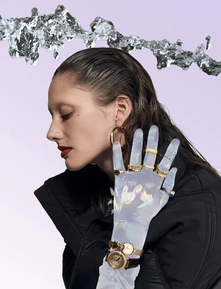 MM6 Maison Margiela nylon puffer jacket with down filling and polyester shirt, Club21 Forum. Metal earrings, www.bonheurjewelry.com. Panthere de Cartier ring in 18K yellow gold with tsavorite garnets and onyx (on pinkie), 18K pink gold with tsavorite garnets and onyx (on base of fourth finger), 18K yellow gold with emeralds, onyx and diamonds (on base of middle finger), and 18K pink gold with emeralds and diamonds (on base of index finger); Clash de Cartier small 18K pink gold earrings (worn as rings on fourth and index fingers); La Panthere 18K yellow gold watch with diamonds, tsavorites, lacquer and quartz; and Pasha de Cartier 18K pink gold watch with diamonds on alligator skin strap, Cartier. Gloves and all other jewellery, stylist's own