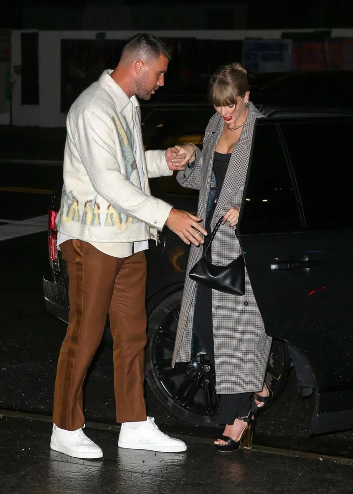 An October 2023 photo of American pop star Taylor Swift carrying an Aupen bag while out with her boyfriend, footballer Travis Kelce.