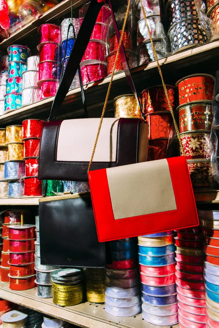Clockwise from top: Frame calfskin shoulder bags, and Clasp calfskin shoulder bag, Celine