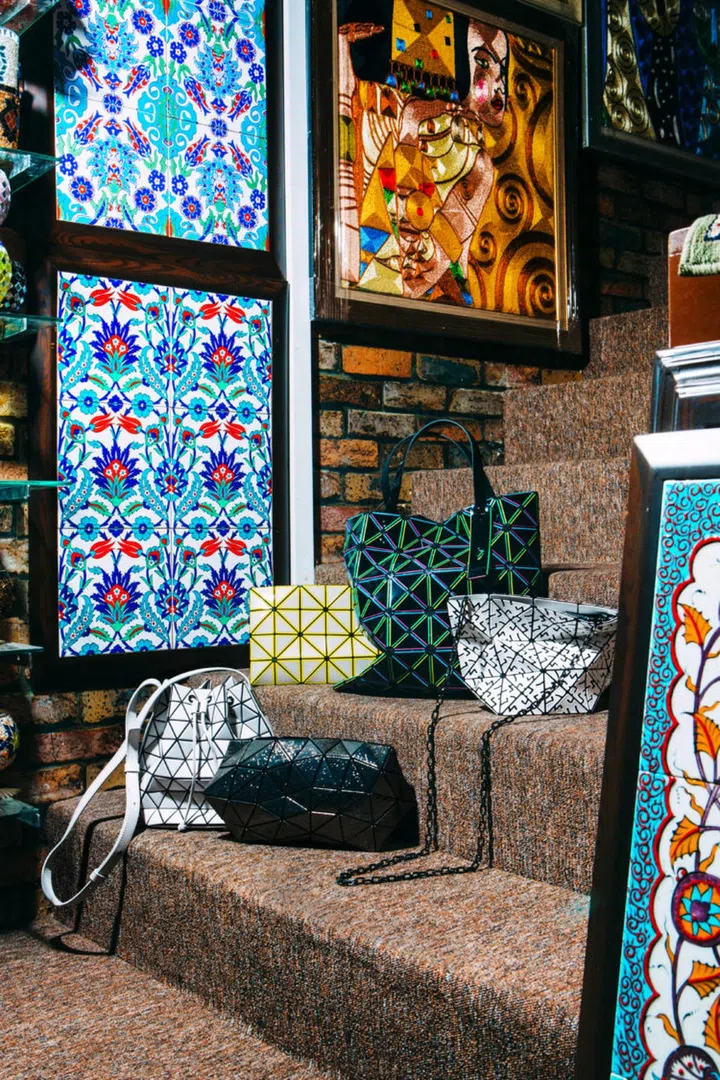 Front row, from left: Lander PU, nylon and leather bucket bag, and Distortion PU and nylon clutch. Back row, from left: Lucent Inlaid PU, vinyl and nylon pouch, Lucent Comet PU, vinyl and nylon tote, and Lucent Bug PU and nylon shoulder bag, all Bao Bao Issey Miyake