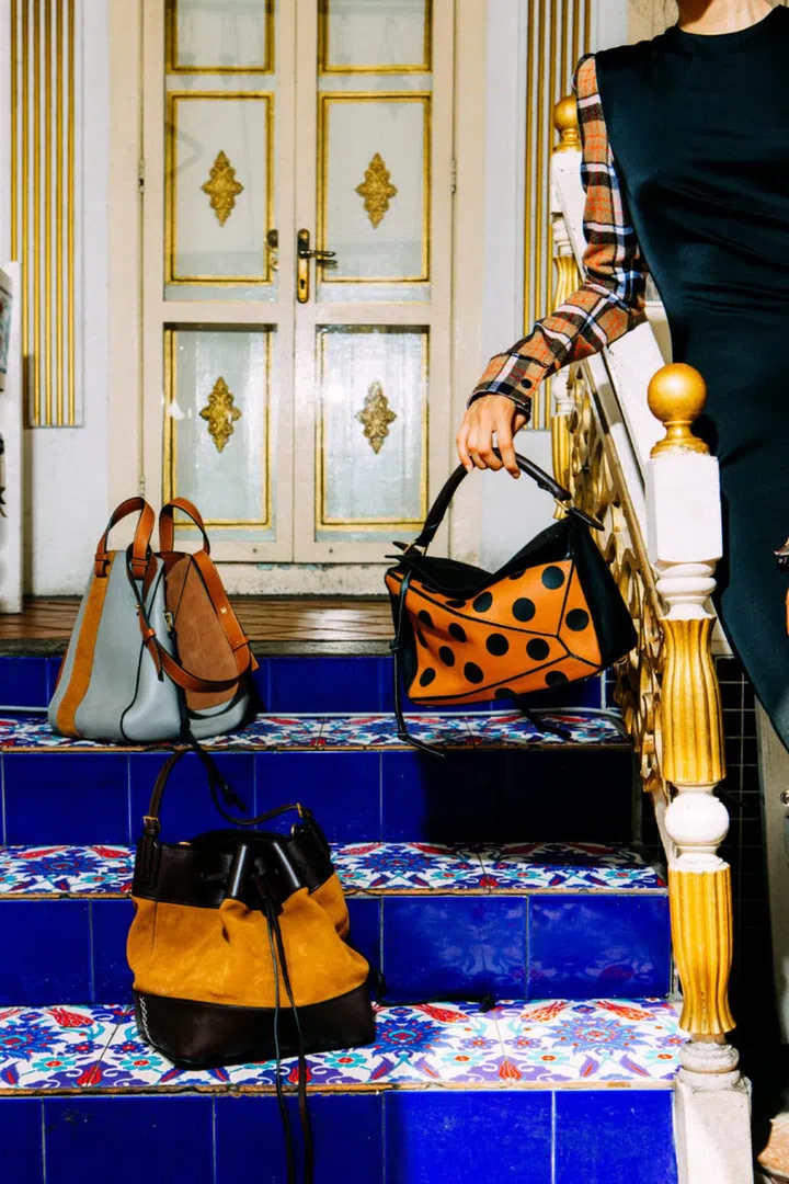 From left: Hammock leather tote, Midnight leather and suede bucket bag, and Puzzle Circles leather satchel. Viscose-blend sheath dress with wool, Loewe