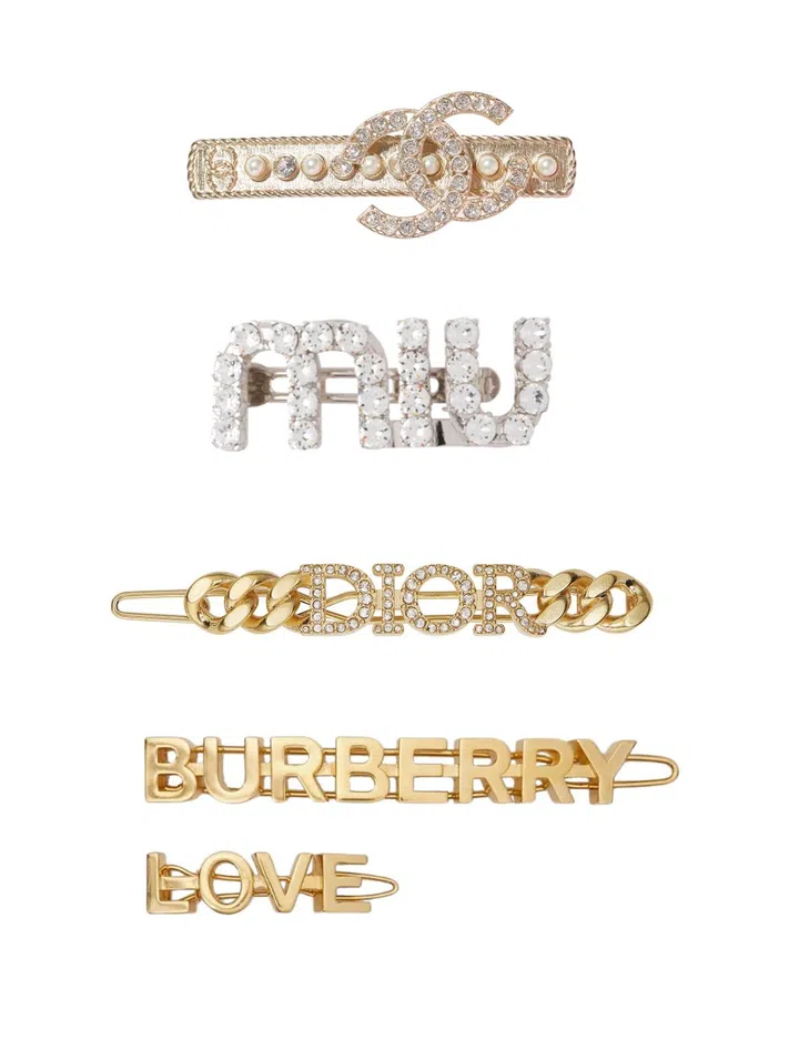 (From top) Metal barrette with glass beads and strass, Chanel. Dio(r)evolution metal hairpin with crystals, Dior. Metal hair clip with crystals, Miu Miu. Metal hair clips (sold as a pair), Burberry