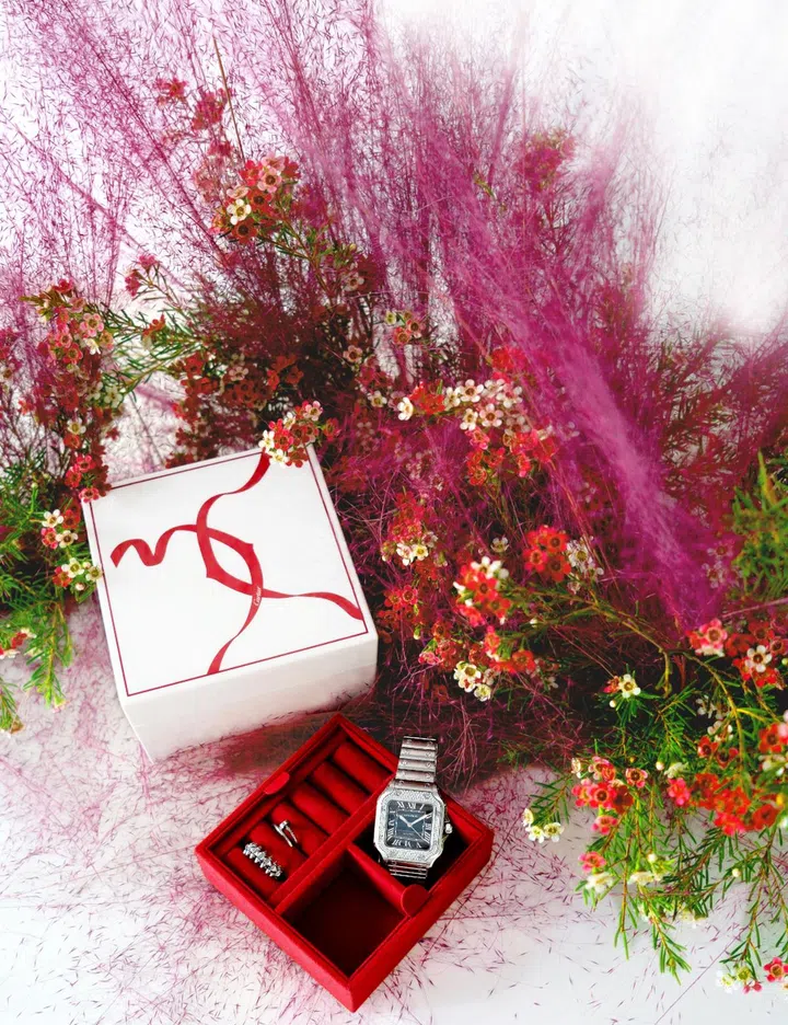 Entrelaces de Cartier lacquered wood jewellery box, Clash de Cartier medium white gold ring (left), Juste un Clou small white gold ring and Santos de Cartier medium stainless steel watch with diamonds on steel bracelet, Cartier