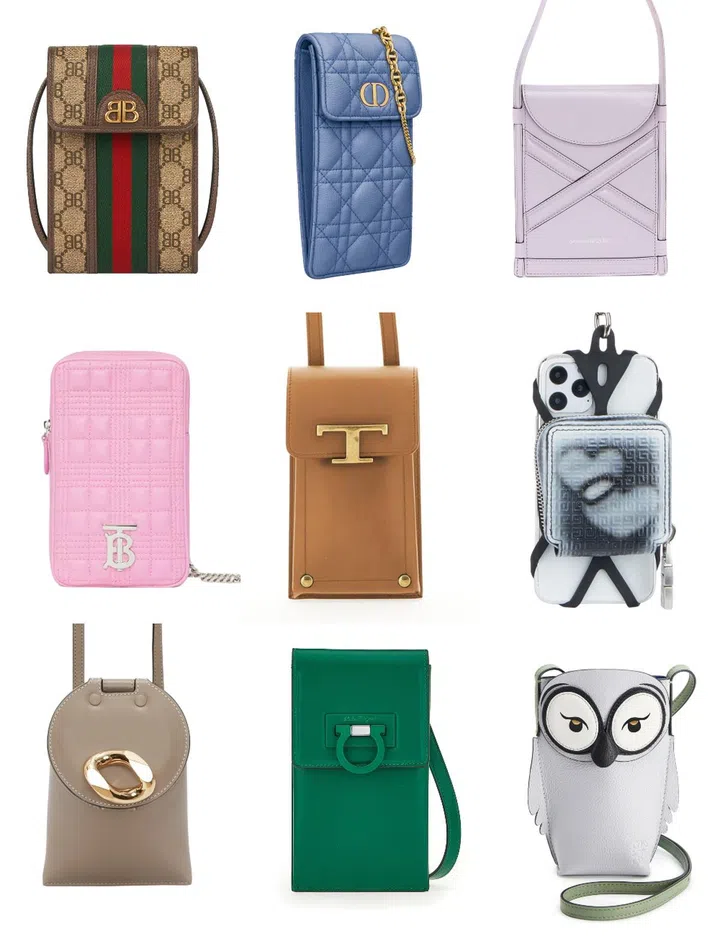 (Top row, from left) Hacker coated canvas, Balenciaga. Caro leather, Dior. Curve leather, Alexander McQueen. (Middle row, from left) Lola lambskin, Burberry. Timeless leather, Tod’s. Chito rubber with attached leather AirPods case, Givenchy. (Bottom row, from left) JW Anderson Lid Pocket leather, Club 21. Gancini leather, Salvatore Ferragamo. Owl Pocket leather, Loewe