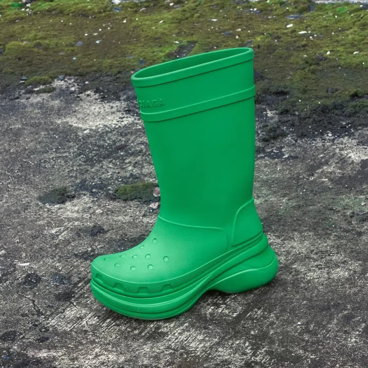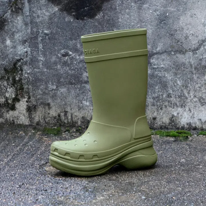 The footwear series which is part of Balenciaga's Spring 2022 collection boasts a pair of wellington boots dubbed Crocs Boot and a pair of mules called Crocs Madame that is fixed with an 80mm heel.