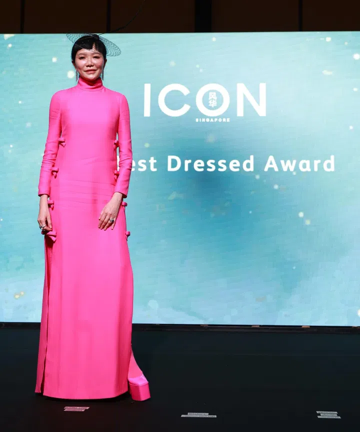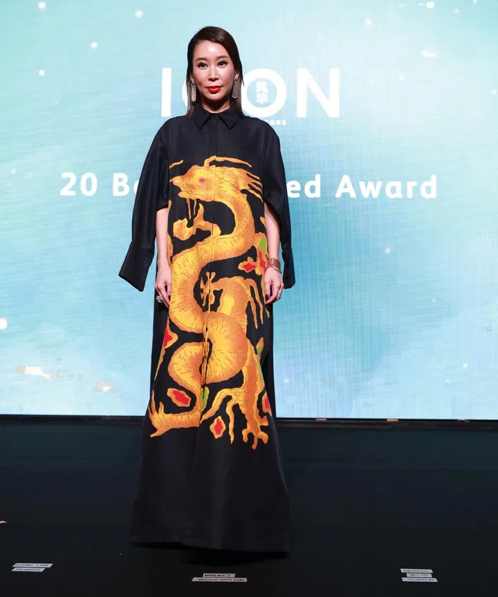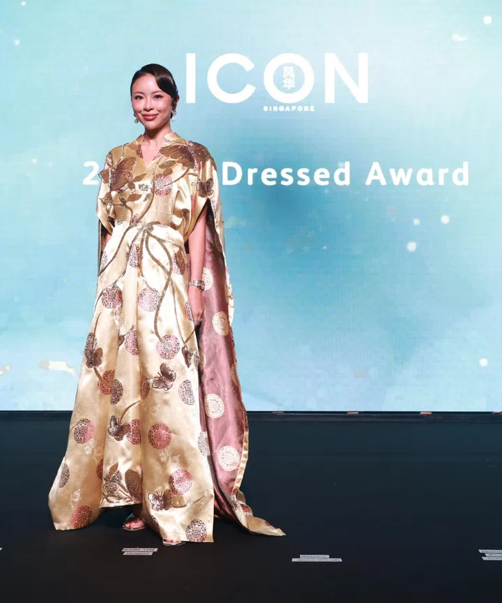This regal Gucci dress features a Mandarin collar and looked like liquid gold on Loh May-Han. The colour is an apt choice too considering how the gold is the symbol of nobility and magnificence in Chinese culture. Also, clock the Tiffany & Co. Bird on a Rock perched on her hairpin.