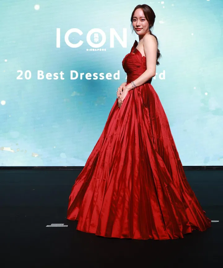 F&B entrepreneur Amanda Toh Steckler wore an intricately embroidered Fendi Couture haute couture short dress with a cape silhouette. She complemented her red ensemble with her refreshing makeup which comprised fiery red lips and flushed cheeks.